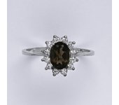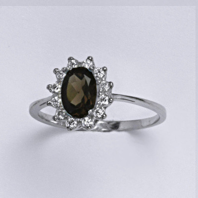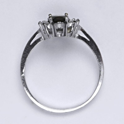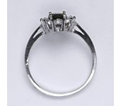 Zlatý prsten s přírodní záhnědou a malými čirými zirkony. Velikost záhnědy je 7x5 mm. Materiál je bílé zlato 585/1000. Orientační váha prstenu ve velikosti 54 je 2,37 g.
