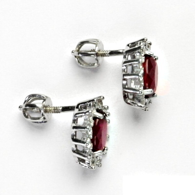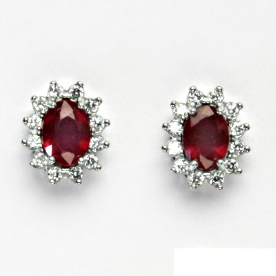 Náušnice z bílého zlata jsou zdobeny malými čirými zirkony a přírodním rubínem 7x5 mm. Materiál je zlato 585/1000. Rozměr náušnice je 11x10 mm. Náušnice mají zapínání na šroubek. Orientační váha náušnic je 3,1 g.