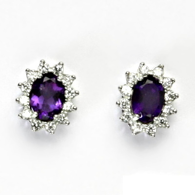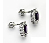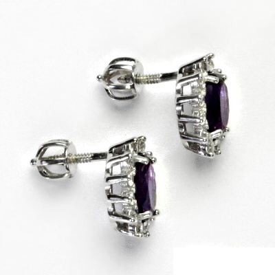 Náušnice z bílého zlata jsou zdobeny malými čirými zirkony a přírodním tmavým ametystem 7x5 mm. Materiál je zlato 585/1000. Rozměr náušnice je 11x10 mm. Náušnice mají zapínání na šroubek. Orientační váha náušnic je 3,1 g.