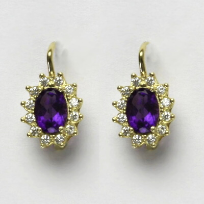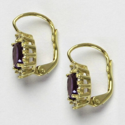 Náušnice jsou vyrobeny ze žlutého zlata. Jsou zdobeny přírodním ametystem tmavým o rozměru 7x5 mm a malými čirými zirkony. Celková výška náušnice je 18 mm. Materiál je zlato 585/1000. Orientační váha náušnice 3,40 g.