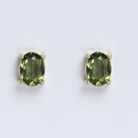 Zlaté náušnice ze žlutého zlata 14 karátů s přírodním vltavínem. Velikost kamene je 7 x 5 mm. Náušnice mají zapínání na šroubek. Orientační váha náušnic je 1,74 g.