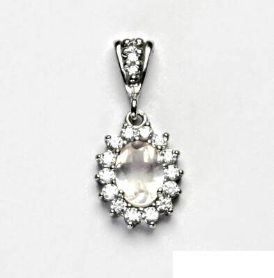 Přívěsek z bílého zlata je zdoben čirými zirkony a přírodním růženínem o rozměru 8x6 mm. Materiál je zlato 585/1000. Rozměr přívěsku je 24 mm včetně očka na výšku a 11 mm na šířku. Orientační váha přívěsku 2,10 g.