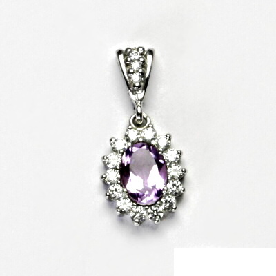 Přívěsek z bílého zlata je zdoben čirými zirkony a přírodním světlým ametystem o rozměru 8x6 mm. Materiál je zlato 585/1000. Rozměr přívěsku je 24 mm včetně očka na výšku a 11 mm na šířku. Orientační váha přívěsku 2,10 g.