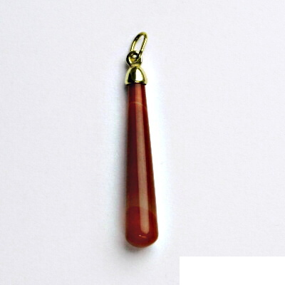 Zlatý přívěsek je zdoben přírodním karneolem. Materiál je zlato 585/1000. Orientační váha přívěsku je 1,69 g. Rozměr přívěsku je 39 mm včetně očka na výšku a 6 mm na šířku.