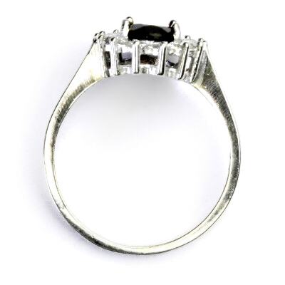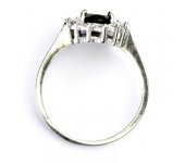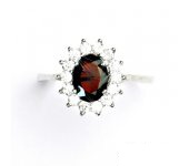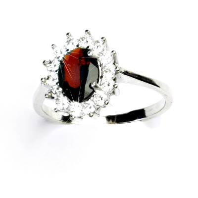 Prstýnek z bílého zlata je zdoben malými čirými zirkony a přírodním granátem o rozměru 8x6 mm. Materiál je zlato 585/1000. Orientační váha prstenu ve velikosti 54 je 3,05 g. Prsten nabízíme v různých velikostech.