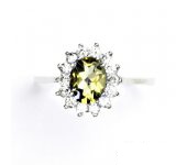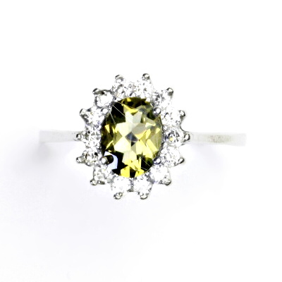 Prstýnek z bílého zlata je zdoben malými čirými zirkony a přírodním olivovým křemenem o rozměru 8x6 mm. Materiál je zlato 585/1000. Orientační váha prstenu ve velikosti 54 je 3,05 g. Prsten nabízíme v různých velikostech.