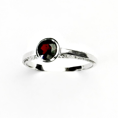 Prstýnek z bílého zlata je zdoben přírodním granátem o průměru 5 mm. Materiál je zlato 585/1000. Orientační váha prstenu ve velikosti 50 je 1,96 g.