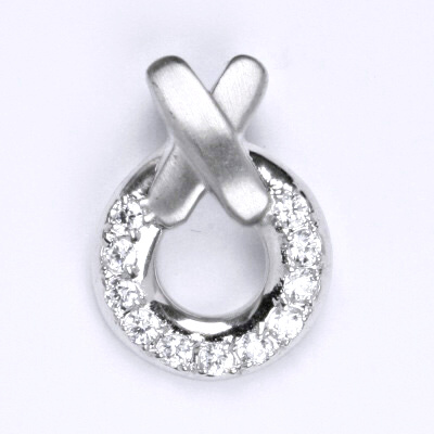 Přívěsek vyrobený z bílého zlata 14 karátů 585/1000, zdobený syntetickým zirkonem a pískováním. Celková velikost přívěsku včetně ouška je 22 mm. Při více kusech skladem je váha orientační.