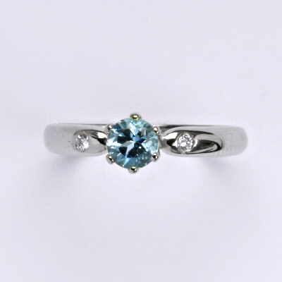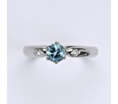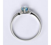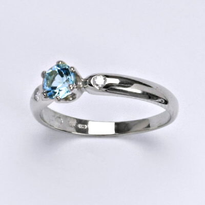 Zlatý prsten z bílého zlata s dvěma diamanty a přírodním topazem swiss. Průměr 2 diamantů je 1,30 mm kvality Si1H a mají dohromady 0,024 karátů. Průměr topazu je 4,5 mm. Orientační váha ve velikosti 52 je 1,93 g.