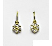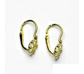 Dětské zlaté náušnice jsou zdobeny čirými zirkony a mají tvar kytičky. Materiál je zlato 585/1000. Rozměr kytičky je 6 mm. Celková výška náušnice je 15,5 mm. Náušnice mají zapínání na brizuru.