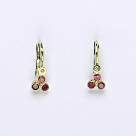 Dětské náušnice ze žlutého zlata s rubíny. Výška náušnice je 11 mm. Orientační váha náušnic je 0,83 g.