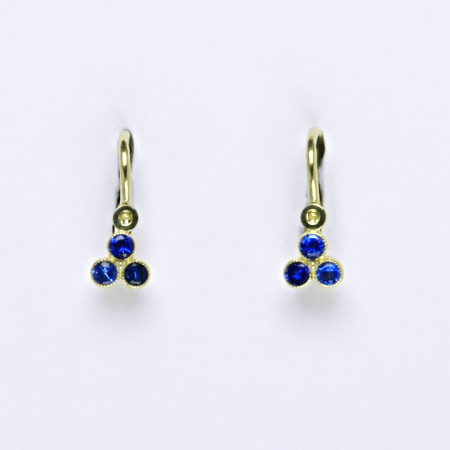 Dětské náušnice ze žlutého zlata se spinely. Výška náušnice je 11 mm. Orientační váha náušnic je 0,83 g.