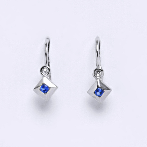 Dětské náušnice bílé zlato s modrým kamínkem, čtverečky. Celková velikost náušnice je 14 mm. Orientační váha náušnic je 0,78 g.