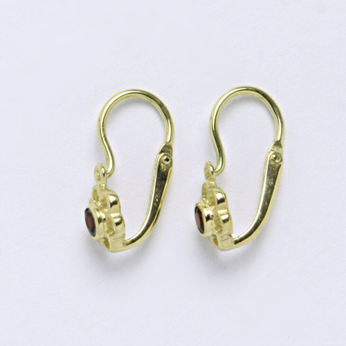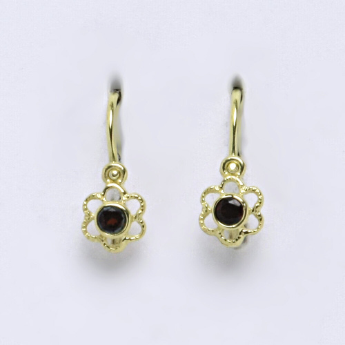 Dětské náušnice žluté zlato s přírodním granátem, kytičky. Celková velikost náušnice je 14 mm. Orientační váha náušnic je 0,90 g.Hmotnost drahého kovu u tohoto zboží je nižší než 0,5 g za 1 kus ( 1 gram u 1 páru ), a proto je opuncováno rizostní značkou nebo popřípadě značkou výrobce.