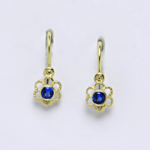 Dětské náušnice žluté zlato s modrým kamínkem, kytičky. Celková velikost náušnice je 14 mm. Orientační váha náušnic je 0,90 g.Hmotnost drahého kovu u tohoto zboží je nižší než 0,5 g za 1 kus ( 1 gram u 1 páru ), a proto je opuncováno rizostní značkou nebo popřípadě značkou výrobce.