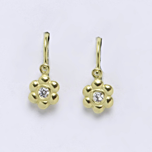 Dětské náušnice žluté zlato s bílým kamínkem, kytičky. Celková velikost náušnice je 14 mm. Orientační váha náušnic je 0,89 g.