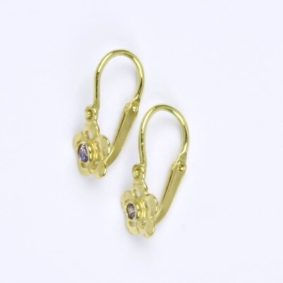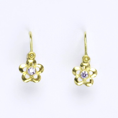 Zlaté dětské náušničky s ametystem ve tvaru kytičky, žluté zlato. Celková výška náušnice je 14 mm. Orientační váha náušnic je 0,80 g.