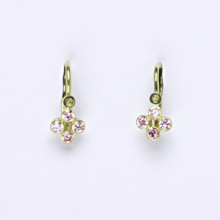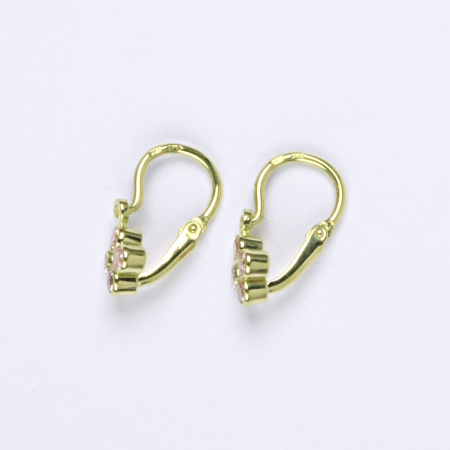 Dětské náušnice ze žlutého zlata s růžovými zirkony. Výška náušnice je 12 mm. Orientační váha náušnic je 0,91 g.