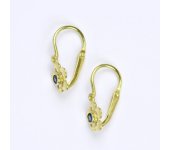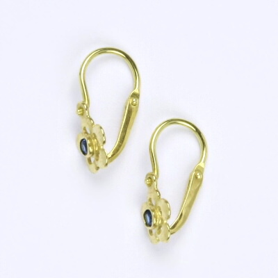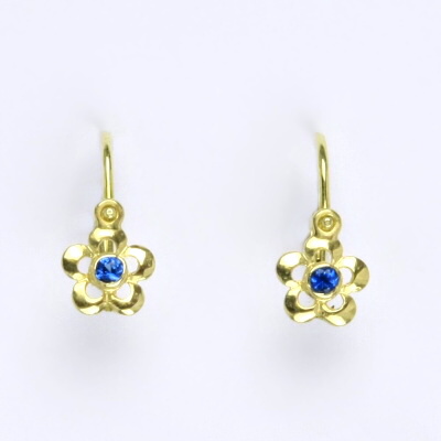 Zlaté dětské náušničky se spinelem ve tvaru kytičky, žluté zlato. Celková výška náušnice je 14 mm. Orientační váha náušnic je 0,80 g.