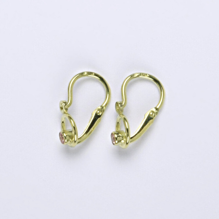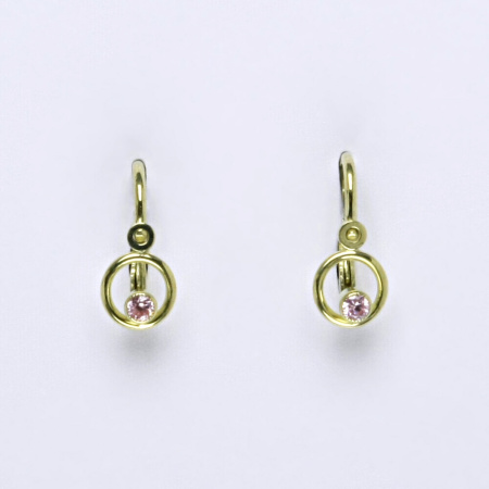 Dětské náušnice ze žlutého zlata s růžovým zirkonem. Výška náušnice je 12 mm. Orientační váha náušnic je 0,79 g.