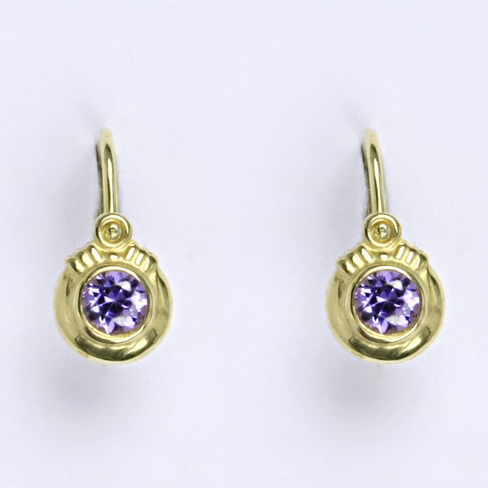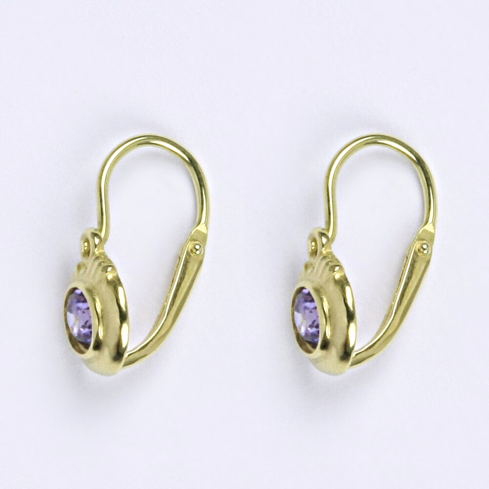 Zlaté náušnice s ametystem ze žlutého zlata. Výška náušnice je 15 mm. Orientační váha náušnic je 1,25 g.