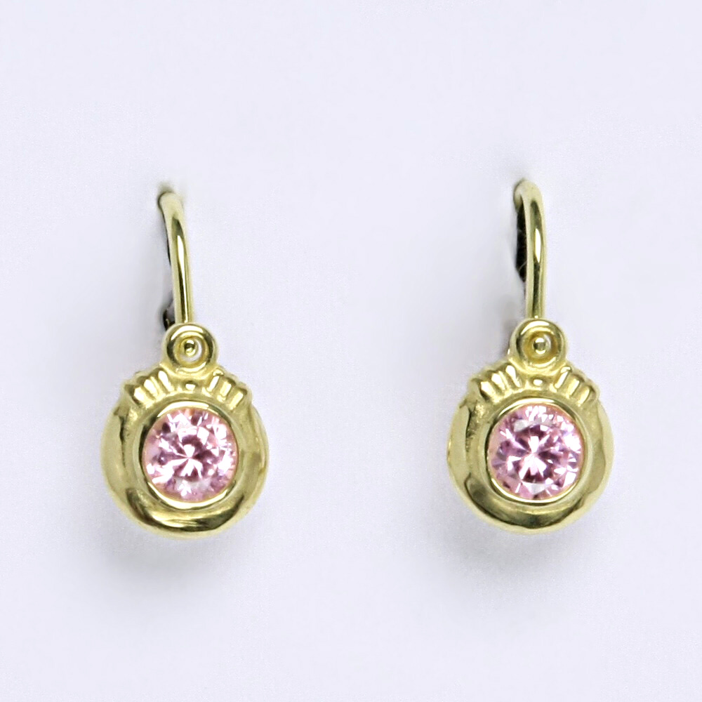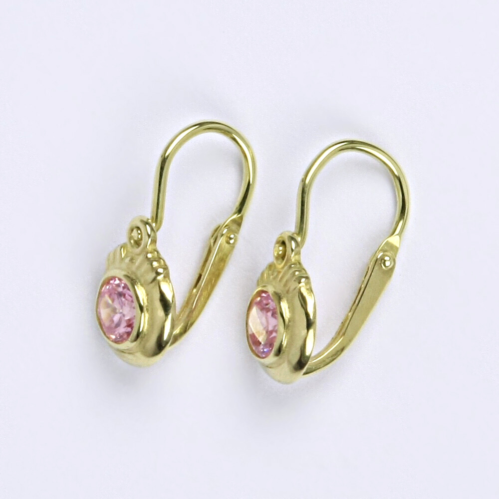 Zlaté náušnice s růžovým zirkonem ze žlutého zlata. Výška náušnice je 15 mm. Orientační váha náušnic je 1,25 g.