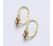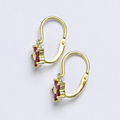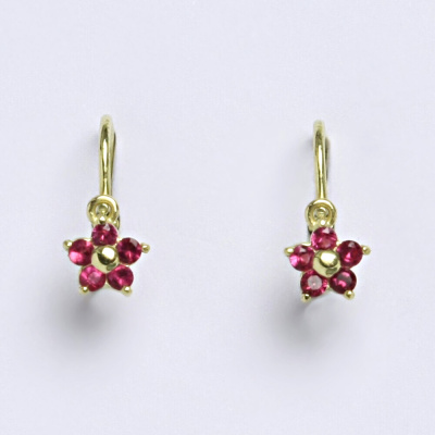 Dětské náušnice ze žlutého zlata se syntetickým rubínem. Celková výška náušnice je 13 mm. Materiál je zlato 585/1000.Orientační váha páru dětských náušnic je 1,03 g.