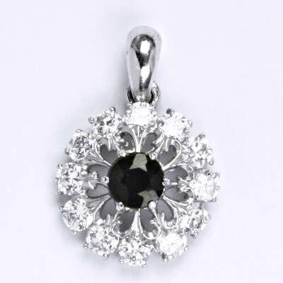 Přívěsek vyrobený z bílého zlata 14 katárů 585/1000, zdobený přírodním safírem a syntetickým zirkonem. Celková velikost přívěsku včetně ouška je 25 mm. Při více kusech skladem je váha orientační.