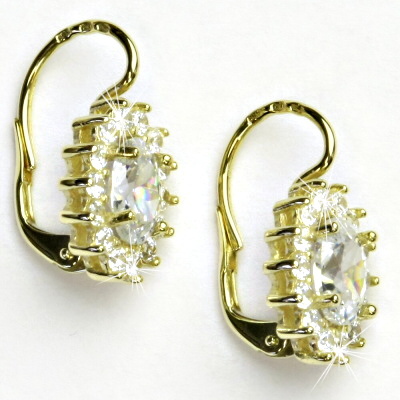 Náušnice ze žlutého zlata jsou zdobeny čirými zirkony, největší má rozměr 8x6 mm. Materiál náušnic je zlato 585/1000. Celková rozměr náušnice na výšku je 20 mm a 11,5 mm na šířku. Orientační váha náušnic je 3,9 g.