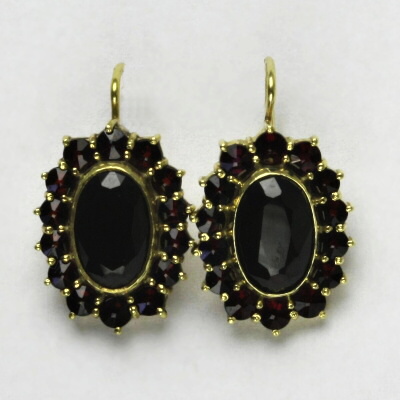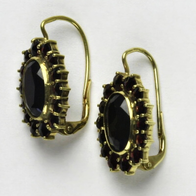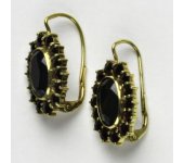 Náušnice ze žlutého zlata jsou zdobeny přírodními granáty. Středový granát má rozměr 11x6mm a okolní mají průměr 3 mm. Materiál je zlato 585/1000. Orientační váha je 8,51 g. Zapínání je na patent.