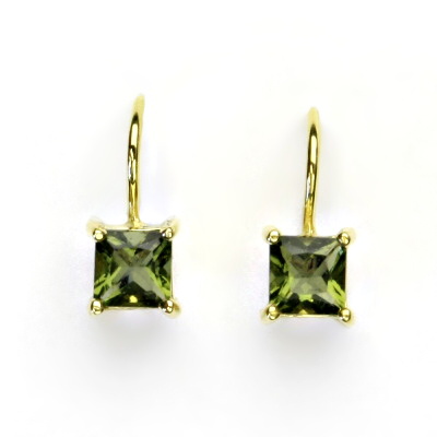Náušnice ze žlutého zlata s přírodním vltavínem o rozměru 5x5 mm. Materiál je zlato 585/1000. Náušnice mají zapínání na klapku. Orientační váha náušnic je 2,34 g. Celková výška náušnice je 15 mm.