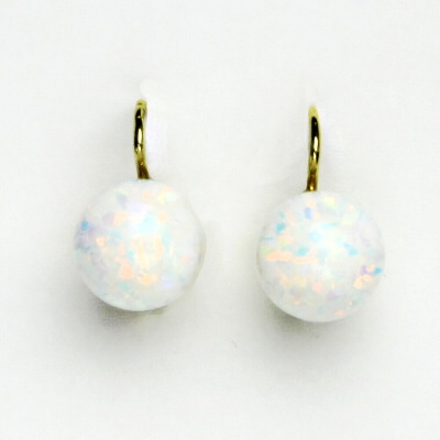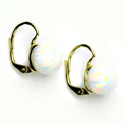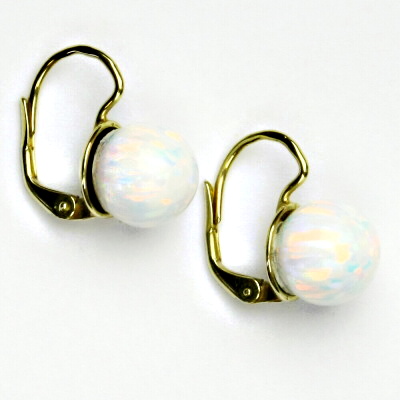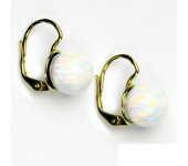 Náušnice ze žlutého zlata jsou zdobeny syntetickým bílým opálem o průměru 10 mm. Materiál je zlato 585/1000. Orientační váha náušnic je 3,98 g. Celková výška náušnice je 16 mm.
