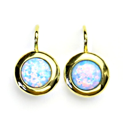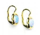 Náušnice ze žlutého zlata jsou zdobeny světle modrým syntetickým opálem o průměru 7 mm. Materiál je zlato 585/1000. Orientační váha náušnic je 2,78 g. Celková výška náušnice je 17 mm.