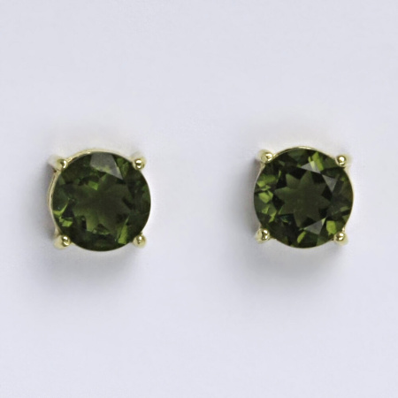 Zlaté náušnice ze žlutého zlata 14 karátů s přírodním vltavínem. Velikost kamene je 7 mm. Náušnice mají zapínání na na šroubek. Orientační váha náušnic je 2,52 g.