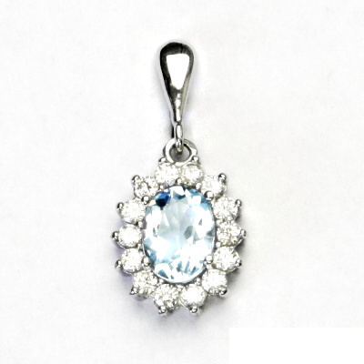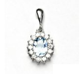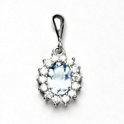 Přívěsek z bílého zlata je zdoben čirými zirkony a přírodním topazem sky o rozměru 8x6 mm. Materiál je zlato 585/1000. Rozměr přívěsku je 24 mm včetně očka na výšku a 11 mm na šířku. Orientační váha přívěsku 2,02 g.