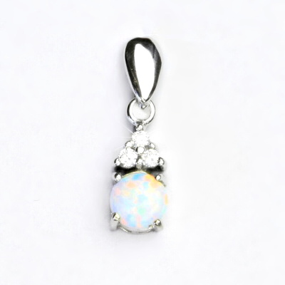 Přívěsek z bílého zlata s čirými zirkony a bílým syntetickým opálem o průměru 6 mm. Materiál je zlato 585/1000. Orientační váha přívěsku je 1,56 g. Rozměr přívěsku je 20 mm včetně úchytu na výšku a 6 mm na šířku.