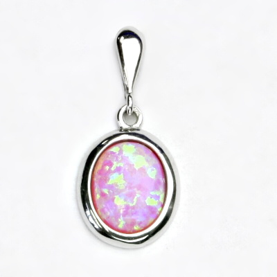 Přívěsek z bílého zlata je zdoben růžovým syntetickým opálem 10x8 mm. Materiál je zlato 585/1000. Orientační váha přívěsku je 1,90 g. Rozměr přívěsku je 24 mm včetně úchytu na výšku a 11 mm na šířku.