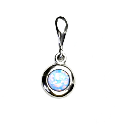 Přívěsek z bílého zlata je zdoben světle modrým syntetickým opálem o průměru 5 mm. Materiál je zlato 585/1000. Orientační váha přívěsku je 0,93 g. Rozměr přívěsku je 19 mm včetně úchytu na výšku a 8 mm na šířku.