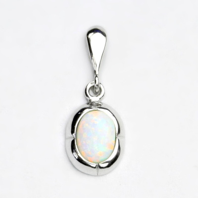 Přívěsek z bílého zlata je zdoben bílým syntetickým opálem o rozměru 8x 6mm. Materiál je zlato 585/1000. Orientační váha je 1,8 g. Rozměr přívěsku je 22 mm včetně úchytu na výšku a 9 mm na šířku.
