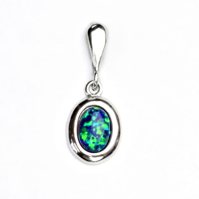Přívěsek z bílého zlata je zdoben zeleným syntetickým opálem o rozměru 7x5 mm. Materiál je zlato 585/100. Orientační váha přívšeku je 1,30 g. Rozměr přívěsku je 22 mm včetně úchytu na výšku a 8 mm na šířku.