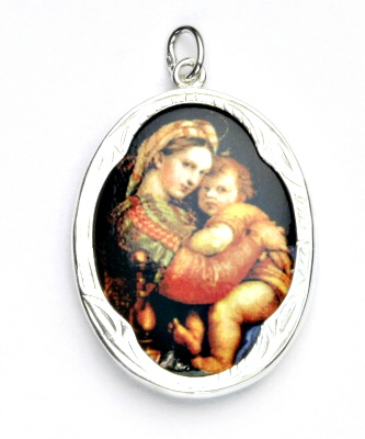 Medailonek Madonka je vyroben z kvalitního porcelánu. Rámeček je vyroben ze bílého zlata. Materiál je zlato 585/1000. Rozměr přívěsku je je 32 mm včetně očka na výšku a 20 mm na šířku. Orientační váha přívěsku je 4,19 g.