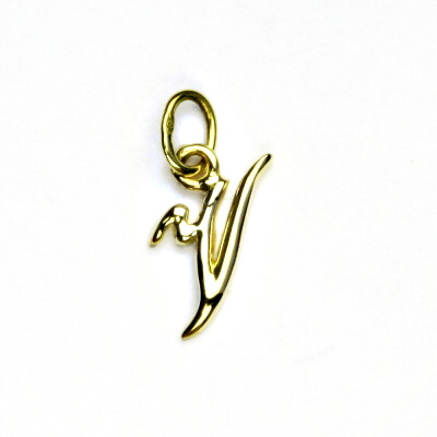 Přívěsek ze žlutého zlata - písmenko "V". Materiál je zlato 585/1000. Orientační váha přívěsku je 0,72 g. Rozměr přívěsku je 17 mm včetně očka na výšku a 6 mm na šířku (v nejširší části).