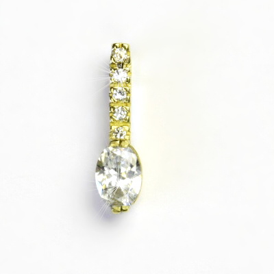 Přívěsek ze žlutého zlata je zdoben čirými zirkony. Materiál přívěsku je zlato 585/1000. Rozměr přívěsku je 19 mm na výšku a 6 mm na šířku. Orientační váha přívěsku je 1,13 g.
