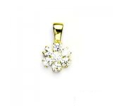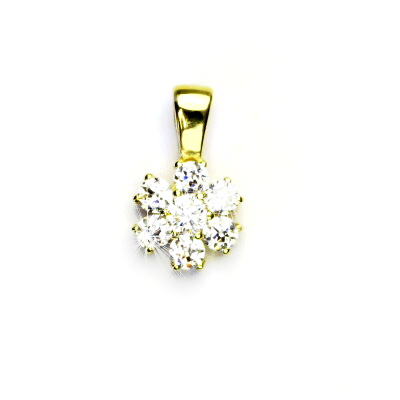 Přívěsek ze žlutého zlata s čirými zirkony - kytička. Materiál je zlato 585/1000. Orientační váha přívěsku je 1,45 g. Rozměr přívěsku je 16 mm včetně úchytu na výšku a 10 mm na šířku.