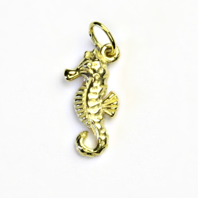Přívěsek ze žlutého zlata - mořský koník. Materiál je zlato 585/1000. Orientační váha přívěsku je 1,01 g. Rozměr přívěsku je 21 mm včetně očka na výšku a 7 mm na šířku.