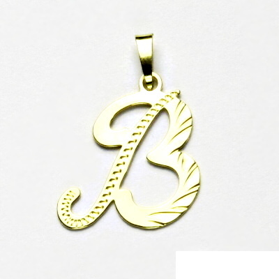 Přívěsek ve tvaru písmenka B ze žlutého zlata. Materiál je zlato 585/1000. Rozměr přívěsku je 23 mm včetně očka na výšku a 14 mm na šířku. Orientační váha přívěsku je 0,80 g