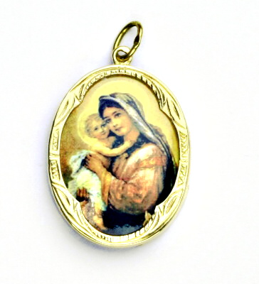 Medailonek Madonka je vyroben z kvalitního porcelánu. Rámeček je vyroben ze žlutého zlata. Materiál je zlato 585/1000. Rozměr přívěsku je je 32 mm včetně očka na výšku a 20 mm na šířku. Orientační váha přívěsku je 4,15 g.