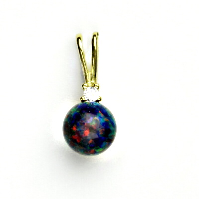 Přívěsek ze žlutého zlata je zdoben syntetickým černým opálem ve tvaru kuličky o průměru 8 mm. Materiál je zlato 585/1000. Orientační váha přívěsku je 1,40 g. Celková výška přívěsku je 18 mm.