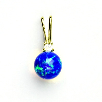 Přívěsek ze žlutého zlata je zdoben syntetickým tmavě modrým opálem ve tvaru kuličky o průměru 8 mm. Materiál je zlato 585/1000. Orientační váha přívěsku je 1,40 g. Celková výška přívěsku je 18 mm.