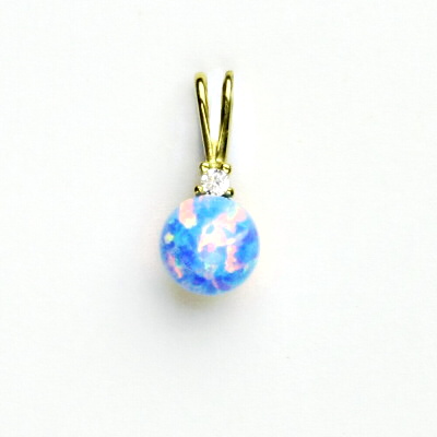 Přívěsek ze žlutého zlata je zdoben malým čirým zirkonem a syntetickým světle modrým opálem ve tvaru kuličky a průměru 6 mm. Materiál je zlato 585/1000. Orientační váha přívěsku je 0,78 g. Celová výška přívěsku je 14 mm.